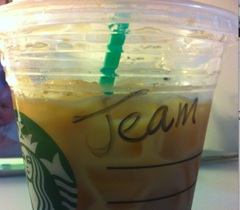 Today’s Alter Ego comes from Jane. She writes: “For some reason the lovely baristas at Starbucks have difficulty with my relatively simple name. Over time, I’ve gotten used being called ‘Jean’ when my drink is ready, but this one today takes the cake. Attached you will find a delightful photo of Jeam’s iced latte.”