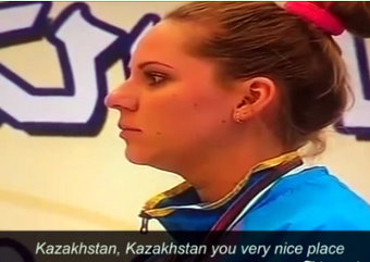 I give Mariya Dmitriyenko full marks for keeping up a look of pride in a moment of silliness. At the Arab Shooting Championship, the winner stood on the podium for the medal ceremony and instead of hearing Kazakhstan’s real national anthem she heard the obscene anthem that had been made up for the “Borat” movie.