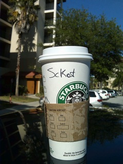 Today’s Starbucks Alter Ego was submitted by Scott. He was puzzled to see that his name is spelled with a ‘k’ in Florida, at least at Starbucks anyways.