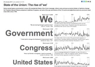 I came across a great analysis while pouring over coverage of last night’s State of the Union address. The BBC took the text from every presidential address since 1790 and ran them through a word counter. Then they looked at which “nouns and adjectives (and one pronoun)” showed up the most frequently over the past 221 years. ‘We’ was the hands-down winner.