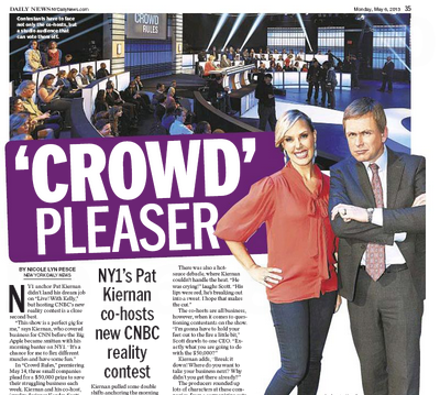 The New York Daily News gave my new show on CNBC a shout out in this morning’s paper. They note the onscreen chemistry my co-host jewelry designer Kendra Scott and I have (we both have kids the same age) and details how I got through a week of pulling double duty at NY1 while taping the show—a strategy the crew came to refer to as “Pat naps.” “Crowd Rules” debuts on May 14—hope you tune in!