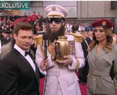 Getting “Punk’d” is so last year. Last night, Ryan Seacrest found himself in the crosshairs of prankster Sacha Baron Cohen. Dressed as a character from his new movie—King Aladeen—Cohen was carrying an urn, which held the ashes of “his late doubles partner” Kim Jong Il, as he stopped to chat on the Oscars red carpet.  The Borat star was happy to chat with Seacrest when he stopped him, and Seacrest looked happy too—until Cohen suddenly dumped the urn all over Seacret’s tuxedo.  Seacrest handled it well but was clearly not interested in laughing along with the prank. He seemed a little too shocked to come up with a good comeback though Cohen had one ready: “Now when somebody asks what you are wearing,” he told Seacrest while being escorted away, “you can tell them a Kim Jong Il.”