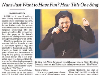 The New York Times tells the unlikely story of Sister Cristina Scuccia, a 25-year-old nun who has become a sensation on the Italian version of The Voice. Wearing a full habit, she’s belted out top-notch versions of “No One” by Alicia Keys and won a sing-off of the Cyndi Lauper hit “Girls Just Wanna Have Fun.” She’s led to a surge in the ratings for the show - and has stirred a huge reaction in Italy and beyond. VIDEO