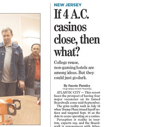 The Philadelphia Inquirer dives into the future of Atlantic City, which faces the prospect of losing four casinos (and a third of its property tax revenue) in a single year. The Atlantic Club has already closed and Trump Plaza plans to close in September. Revel and Showboat could close shortly if they can’t find buyers by summer’s end. As far as all that empty space goes, one college has proposed turning a casino into a campus, complete with housing. Revel could become luxury condos.