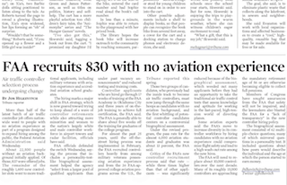 The Chicago Tribune says since the FAA changed its requirements in an effort to expand hiring, more than half of all air traffic controller job offers have gone to people with no aviation experience. Of the 22,500 people without an aviation background, 837 were offered a job. The FAA says its biographical assessment test helped the agency select from a larger pool of qualified applicants.