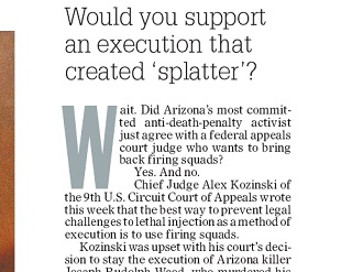The latest execution gone awry, this time in Arizona, has advocates both for and against the death penalty squaring off. In the Arizona Republic, columnist EJ Montini writes about the federal appeals court judge who called for the return of the firing squad. Chief Judge Alex Kozinski was upset over the court’s decision to stay the execution of Arizona killer Joseph Rudolph Wood (a ruling that was overturned by the Supreme Court leading to yesterday’s execution). Judge Kozinski argues that drugs are to be used to help people with medical conditions, while no one can argue with the intended purpose of firearms and ammunition. He says we need to own up to the brutality of executions or not carry them out at all.