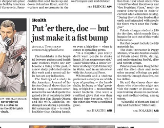 A recent study found handshakes transferred more than twice as many bacteria as fist bumps. The Cleveland Plain Dealer says that’s adding ammunition to the arguments of doctors who say handshakes should be banned in hospitals. Some doctors’ groups say handshaking in hospitals generates unnecessary risks.