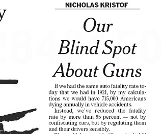 New York Times Op-Ed columnist Nicholas Kristof draws an interesting parallel between car safety and gun safety. He says we could have easily made the case decades ago that “Cars don’t kill people—people kill people …” But instead we passed speed limits and air bag requirements and drivers license requirements. But Kristof says the country has passed up on similar opportunities to innovate in gun safety.