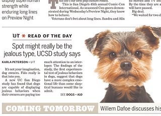 Did you ever get the feeling your dog gets jealous when you pay more attention to someone else? You may be right. A new University of California San Diego study finds dogs are capable of displaying jealous behaviors, suggesting dogs are more emotionally complex than once thought. The San Diego Union-Tribune says the study also supports the theory that jealousy is a primordial emotion, that is not limited to humans.