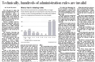 The Washington Post says about 1800 rules passed by the Obama administration over the past two years are technically not valid - because they were never reported to Congress as required. But there’s not much anyone can do about it. Congress also barred such federal rules from judicial review, meaning no one can demand the administration submit the required paperwork.
