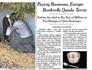 The United States, famously, refuses to pay ransoms. But that’s not the case everywhere. The New York Times makes the case in a front page story that European nations essentially bankroll Al Qaeda and its affiliates by caving in to ransom demands. While European governments deny paying ransoms, an investigation by the Times found that Al Qaeda has taken in $125 million in revenue from kidnappings since 2008. In some cases the governments mask the payments as development aid.