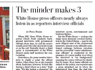 When a government official sits down for an interview, he or she will nearly always have a chaperone - from the White House. The Washington Post says nearly every officially sanctioned interview with a “senior administration official” is done with a White House press staffer in the room. The paper says journalists see these monitors as an attempt to shape the news coverage and control the message. The papers have to play along with the system or else risk not getting the interview at all.