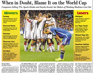 Television sales soared while other appliance sales slowed - and it’s all thanks to the World Cup. The Wall Street Journal says no less than 100 public companies have commented about how the World Cup affected their business. Makers of snack foods and sports drinks did particularly well - but companies like American Airlines and Denny’s saw less business.