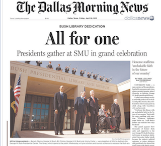 “All for One” is the headline in the Dallas Morning News this morning. The five living presidents gathered in the city yesterday at the opening of the George W. Bush presidential library. Despite their differing views, the former occupants of the White House all found something nice to say about the 43rd president. President Obama praised him for being a man who “takes his job seriously, but he doesn’t take himself too seriously. He is a good man.”
