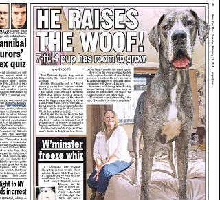 The New York Post introduces us to Freddy, an 18-month-old, 7-foot-4 Great Dane who dwarfs his owner, 5-foot-4 Claire Stoneman. He’s still growing and is poised to become the world’s tallest dog. Stoneman says living with Freddy requires some compromises, such as early walks, because if he wants to run after a dog, she says she wouldn’t be able to stop him.