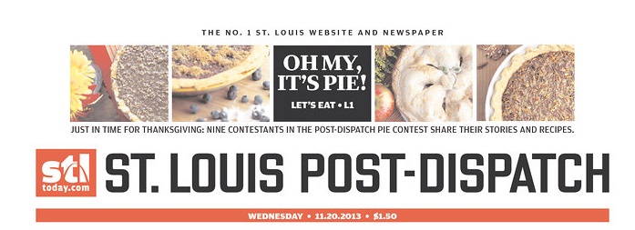 I posted a blog entry yesterday about my preference for Pumpkin Pie. But if you’re looking to go beyond the traditional pumpkin this Thanksgiving, the St. Louis Post-Dispatch offers up recipes from the 9 winners of its reader pie contest. That includes recipes for Missouri Honey Pecan Pie, Harvest Pear and Cherry Pie a Chocolate Ganache Pie and more.