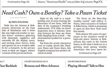 Have a Bentley and need a loan? You’re in luck. The New York Times says Suttons & Robertsons, an English pawnbroker, is preparing to open its first New York location. The shop caters to high-end clients who need quick access to cash in exchange for luxury items. Suttons & Robertsons says it’s able to lend upwards of $1 million to clients.