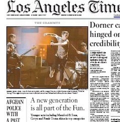 We are young was the theme of last night’s Grammys, says the LA Times. An array of youthful bands—from Indie trio Fun, to Britain’s Mumford and Sons (Album of the Year), to R&B sensation Frank Ocean—swept the awards show. It was also year that “the music business establishment gave up its long, unsuccessful fight against new forms of music dissemination” by embracing music that become popular on YouTube instead of through record sales. The year’s most prolific winner? The Black Keys.