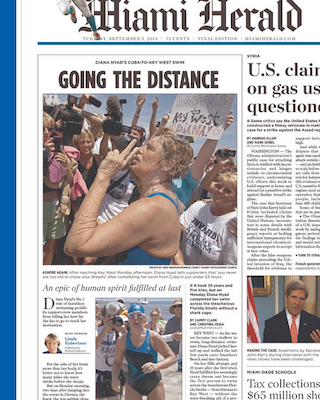 The big photo on the front page of the Miami Herald is of Diana Nyad after completing her historic swim from Cuba to Key West. Honestly, after all of the times we covered her NOT making it, I wasn’t paying a lot of attention until she actually got close to the end.  And it’s a nice story of serious determination and triumph.  The 110-mile swim took 52 hours, 54 minutes and 18.6 seconds to complete and left 64-year-old Nyad bruised and swollen.
