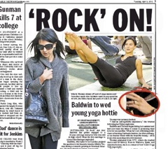 Alec Baldwin got engaged on the weekend to 28-year-old “yoga hottie” Hilaria Thomas says the New York Daily News.  Baldwin went off on Twitter last night on the paper over its efforts to get a photo of the ring from inside her yoga class. They succeeded and describe the diamond as ““huge, very clear, perfect clarity, Cartier.” Scroll down to see a selection of Baldwin’s posts: