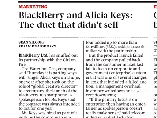 One year after it began, the partnership between Alicia Keys and Blackberry has ended. The Globe and Mail says the deal didn’t make sense anymore after Blackberry decided to turn its focus away from the consumer market and toward corporate and government customers. The arrangement got off to a rocky start when Keys apparently tweeted from an iPhone, though she claimed her account had been hacked.