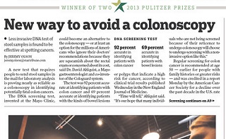 Doctors at the Mayo Clinic have come up with an alternative to the colonoscopy that’s nearly as reliable in detecting cancers, but it’s not without its own “ick” factor. The test involves sending stool samples in the mail. The Minneapolis Star Tribune says the test could become an alternative for the millions of Americans who ignore their doctors’ advice because they’re squeamish about getting a rectal exam.
