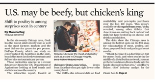 It’s the United States of Chicken. The Chicago Tribune reports that new research from the USDA reveals Americans are cutting back on beef in favor of chicken. But that doesn’t mean we’re getting any healthier. Also on the uptick are consumption levels for cheese and soft drinks.