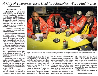 The New York Times has details of an unusual, government-funded program in Amsterdam that aims to get alcoholics off the street, by paying them in beer. Advocates say it’s counter-productive to demand that addicts quit their habits before receiving help. Participants are also provided access to health workers and counselors.
