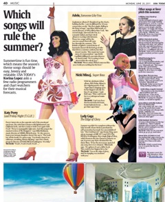 What will the song of the summer be? USA Today has four predictions in this morning’s paper: Katy Perry’s “Last Friday Night,” Adele’s “Someone Like You,” Nicki Minaj’s “Super Bass,” and Lady Gaga’s “The Edge of Glory.” Gaga’s newest hit may get a boost from the fact that it features the late Clarence Clemons on sax.