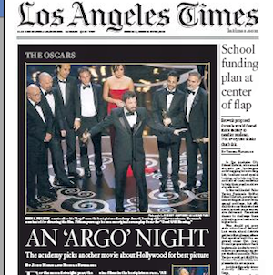 It was an “Argo” night in Hollywood yesterday, says the LA Times. The film took home a statue (presented by Jack Nicholson and First Lady Michelle Obama, no less) for Best Picture in a “night of redemption for Ben Affleck” who was surprisingly left off the list of contenders for Best Director. Ang Lee got that Oscar, for directing “Life of Pi,” while Daniel Day-Lewis won for Best Actor (“Lincoln”) and Jennifer Lawrence won Best Actress (“Silver Linings Playbook”).