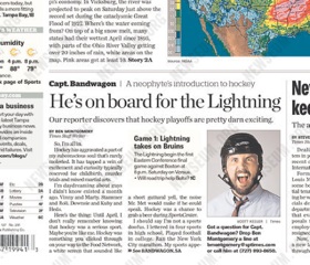 I’ve come to terms with the fact that hockey is a second-class sport in most of America. So I enjoyed St. Petersburg Times reporter Ben Montgomery’s front-page column today about the joys of discovering the sport. Montgomery says after a lifetime of ignoring hockey, he has become the ultimate “bandwagon jumper.”: “I haven’t paid attention to as many Canadians since the Barenaked Ladies debuted.”