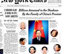 There’s a major investigation on the front page of the New York Times this morning. So major the Chinese government has blocked access to the story on the Internet inside the country. The Times details the billions in wealth—at least $2.7 billion—collected by the family of China’s prime minister Wen Jiabao. In many cases, says the paper, “the names of the relatives have been hidden behind layers of partnerships and investment vehicles involving friends, work colleagues and business partners.”