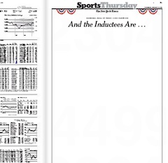 The hidden gem in today’s papers is the cheeky New York Times’s sports section front. Baseball writers refused to nominate any steroid-fueled players to the Hall of Fame, so Times prints a blank page under the headline, “And the Inductees Are…” The paper says catcher Mike Piazza, who has 396 home runs to his name, was caught in the middle. Piazza, who’s never been linked to steroids, garnered 57 percent of the vote but was still overlooked.