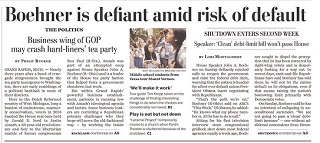 With the government shutdown now into its second week, House Speaker John Boehner is rejecting calls to reopen the government, saying the country will default for the first time ever unless President Obama begins negotiating with Republicans. The White House also firmed up its stance, saying President Obama won’t come to the table until Republicans drop their campaign against Obamacare, end the shutdown and raise the debt ceiling. The Washington Post says analysts predict the government could run out of money by November 1st.