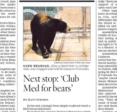Some know him as the Meatball Bear. His 28,000 Twitter followers call him Glen Bearian. The Los Angeles Times says the 400-pound black bear who has been repeatedly spotted in southern California eating leisurely (often meatballs) from trash cans, will now be called a Coloradan. Officials were able to catch Glen Bearian (it was a combo of honey and bacon that nabbed him) and relocate him to a Colorado sanctuary known as the “Club Med for Bears.”