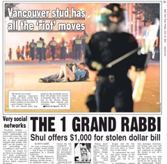 Is it or isn’t it? The New York Post prints a photo that’s sparked a lively debate about its authenticity. Many have questioned whether this in-the-street-kiss photo, taken during the Vancouver riots, which erupted after the Canucks’ Stanley Cup loss on Wednesday, was staged.