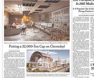 The New York Times details a $1.5 billion dollar project to build a 32,000 ton arch over the damaged nuclear reactor at Chernobyl, Ukraine. The project will all but eliminate the risk of further contamination at the site of the 1986 explosion. The arch will be slid into place on Teflon pads, covering the makeshift shelter that was put in place when the reactor melted down.