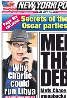 If the main qualification for running Libya is perpetuating a long downward spiral of horrible PR moves and escalating craziness, then move over Moammar Ghadafi—Charlie Sheen is up for the job. Both the New York Post and the Daily News give credence to the swap-one-wacko-for-another idea, the Post in a front-page headline and the Daily News in a full article. Even the Times got in on the act, calling Ghadafi the “Charlie Sheen of Middle Eastern dictators.” The paper says likewise, Charlie Sheen suffers from an addiction that often affects embattled politicians, namely that “he is addicted to explaining himself on the air.”
