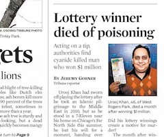 On the front page of the Chicago Tribune this morning, more evidence that winning the lottery is something to avoid. In 2012, Urooj Khan won $1 million from the Illinois Lottery. A month later he died unexpectedly. After receiving a tip from a “concerned relative,” police concluded that Khan had been poisoned with cyanide.