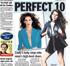 Like mother like daughter is not such a bad aphorism to live up to if a) your mom is Cindy Crawford and b) you’re an aspiring model. The New York Daily News has a photo of 10-year-old Kaia Gerber posing as the face of Versace’s childrens line. On the front page they couldn’t resist a pun: “Chip off the Mole Block.”