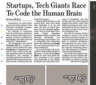 The Wall Street Journal says startups and tech giants including Facebook and Google are racing to create machines that can think like humans. The software is still far off - but developers foresee applications such as fluently translating foreign languages, identifying objects in photos and directing self-driving cars through busy intersections.