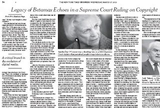 The New York Times points out the similarities between the fight Hollywood put up 30 years ago to get the Sony Betamax outlawed and a recent Supreme Court decision that upheld a student’s right to earn revenue by reselling textbooks. In 1984 Jack Valenti told the Supreme Court that “the VCR is to the American film producer…as the Boston strangler is to the woman home alone,” a fervent argument that didn’t convince Justice Sandra Day O’Connor, who swung the court’s decision 5-4 in favor of the Betamax.