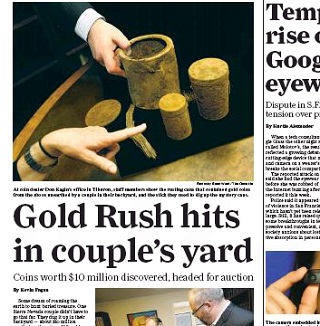 Get ready for another gold rush. The San Francisco Chronicle has the story of a couple who dug up $10 million worth of gold coins in their own backyard. The perfectly preserved $20 coins dated back to the 1890s. The couple is keeping their identity (and location) secret so as not to attract treasure hunters. The coins will soon go up for auction.