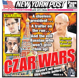 The New York Post has a field day with the Snowden-in-Russia story, framing the whole saga as a B movie called “Czar Wars.” Inside, the paper superimposes Edward Snowden’s face on a pig’s body and says President Vladimir Putin told President Obama to “take a flying leap” when he refused to turn over Snowden, who has been holed up in a Russian airport for two days, over to US authorities. Said Putin: “I’d prefer not to deal with this issue at all. It’s like shearing a piglet — too much squealing, too little wool.”