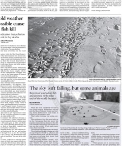 First, it was thousands of dead birds in Arkansas. Then it was millions of dead fish in Maryland. The Baltimore Sun says the spate of strange wildlife stories in the news recently has made some people fear that the end of days is near. Scientists claim to have explanations for both occurrences—the birds were likely victims of New Year’s Eve fireworks; the fish succumbed to colder than normal water—but that hasn’t stopped conspiracy theories from flying around.