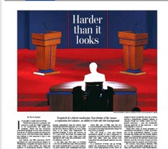 Jim Lehrer is getting ready to “walk down a knife blade.” That’s how he’s described moderating a presidential debate, a job the Washington Post says is much harder than it looks. Not only do you have to ask the right questions with 60 million people watching, you must seem “unobtrusive, yet sharp and insistent…And the whole time, there’s a guy yelling in your earpiece to get to the next question.”