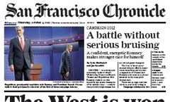 Photos from last night’s presidential debate in Denver are on the front pages of almost every paper I looked at this morning. The San Francisco Chronicle did a nice job presenting their analysis, making a report card to grade candidates on several points. Romney got As for not making any major gaffes, and sounding presidential, while President Obama got high marks in only one category—for being nice to Mitt.