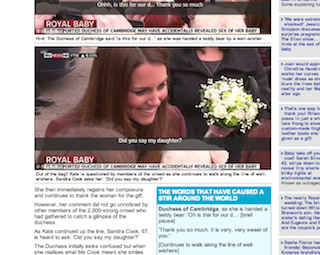 Princess Kate may have let the royal secret out of the bag yesterday. The Daily Mail says after the Duchess of Windsor was handed a Teddy bear by a well-wisher she said, “‘Oh is this for our d…. [brief pause]...Thank you so much. It is very, very sweet of you.’” A woman in the crowd then asked Middleton if she said ‘daughter’ to which the princess replied: “‘No, my. Oh, my? [Wags finger] Oh, no, no, no. I’m sure, I’m sure. We don’t know, so…[looks at the ground].’” Hmmm. Check out the VIDEO and decide for yourself.