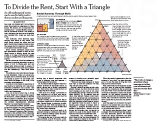 Trying to figure out how to split the rent with your roommates? Try Sperner’s lemma. The New York Times says this old mathematical proposition can be used to fairly divide unequal assets, like apartment rooms of different sizes. It works by using a triangle to create scenarios where you tell which room you’d pick at a variety of prices. The Times article has some interactive features to help you through the process.