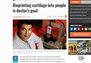 Dr. Darryl D’Lima and his colleagues say they’ve basically figured out how to “bioprint” living cartilage. The San Diego Union-Tribune says the bioprinter is adapted from an old Hewlett-Packard inkjet printer. It sprays out a mixture of cartilage cells and a liquid that congeals under ultraviolet light. The doctor’s aim is to put the technology to use in healing knee injuries.